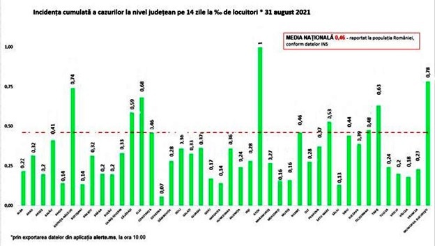 | Nr. crt. | Județ | Număr de cazuri confirmate(total) | Număr de cazuri nou confirmate | Incidența înregistrată la 14 zile |