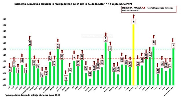 Coeficientul infectărilor cumulate la 14 zile, raportate la 1.000 de locuitori este calculat de către Direcțiile de Sănătate Publică, la nivelul Municipiului București și al județelor. Mai jos aveți graficul realizat în baza raportărilor primite de CNCCI de la Direcțiile de Sănătate Publică: