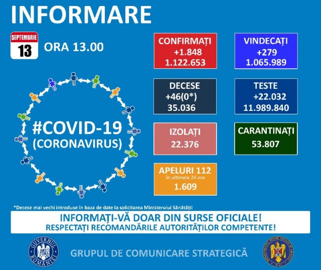 Până astăzi, 13 septembrie, pe teritoriul României au fost confirmate 1.122.653 de cazuri de persoane infectate cu noul coronavirus (COVID – 19).