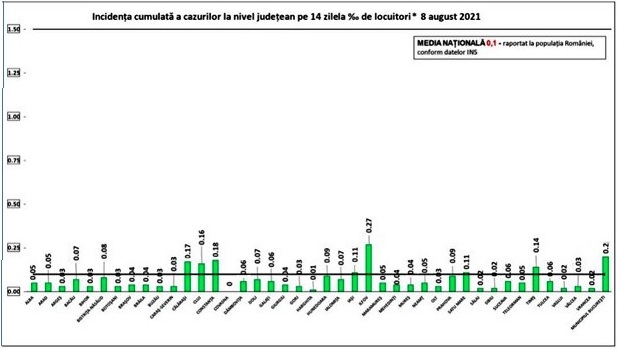 Coeficientul infectărilor cumulate la 14 zile, raportate la 1.000 de locuitori este calculat de către Direcțiile de Sănătate Publică, la nivelul Municipiului București și al județelor. Mai jos aveți graficul realizat în baza raportărilor primite de CNCCI de la Direcțiile de Sănătate Publică: