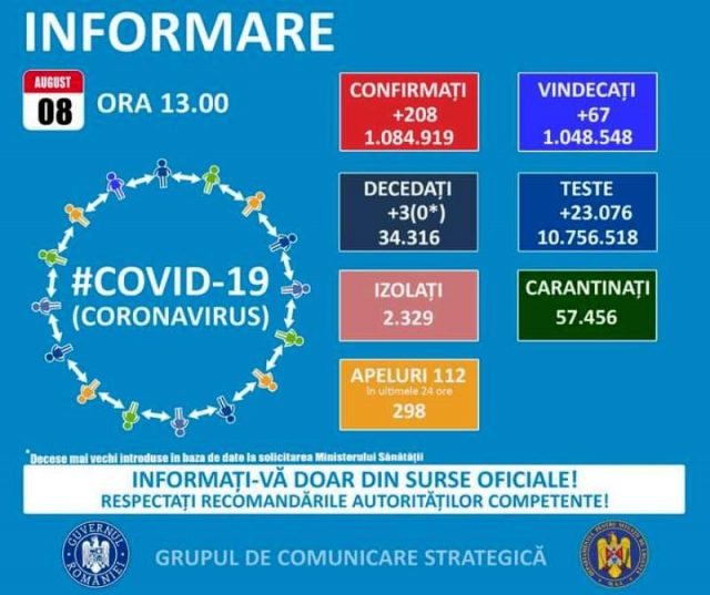 Până astăzi, 8 august, pe teritoriul României, au fost confirmate 1.084.919 cazuri de persoane infectate cu noul coronavirus (COVID – 19).