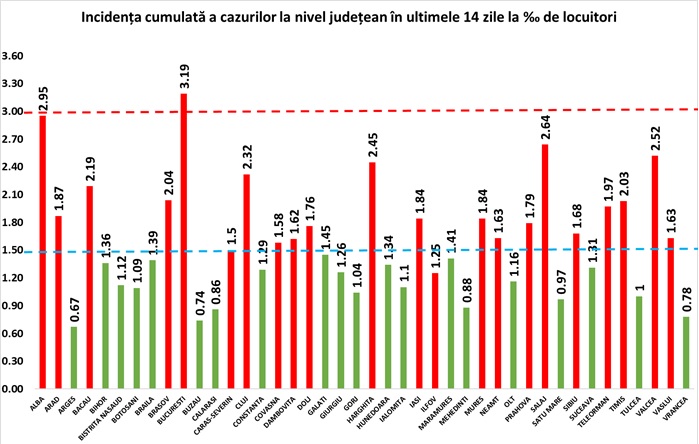 Coeficientul infectărilor cumulate la 14 zile, raportate la 1.000 de locuitori, calculat de către Direcțiile de Sănătate Publică, la nivelul Municipiului București și al județelor este următorul: