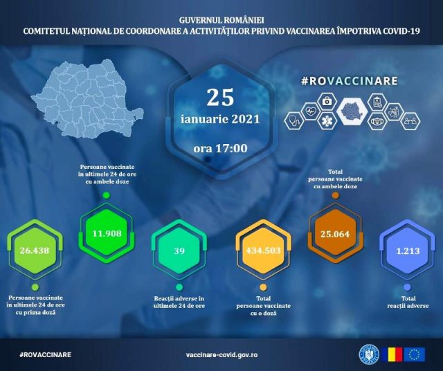 Potrivit datelor puse la dispoziția CNCAV de către Institutul Național de Sănătate Publică, prin aplicația Registrul Electronic Național al Vaccinărilor (RENV), care ține evidența vaccinărilor, situația din ziua de 25 ianuarie a.c., ora 17.00, este următoarea: