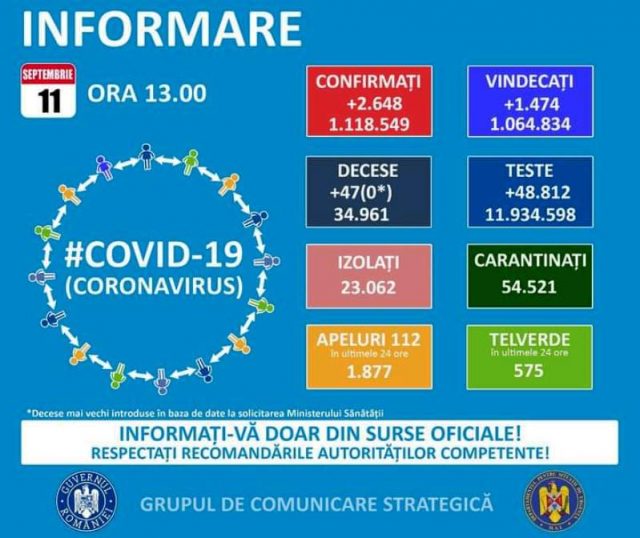 Până astăzi, 11 septembrie, pe teritoriul României au fost confirmate 1.118.549 de cazuri de persoane infectate cu noul coronavirus (COVID – 19).