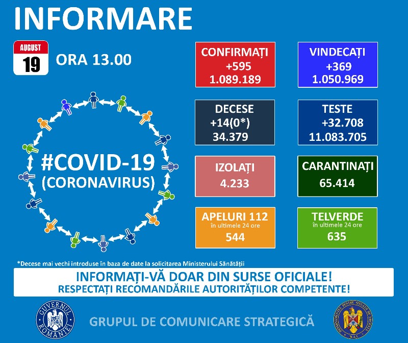 Până astăzi, 19 august, pe teritoriul României, au fost confirmate 1.089.189 de cazuri de persoane infectate cu noul coronavirus (COVID – 19).
