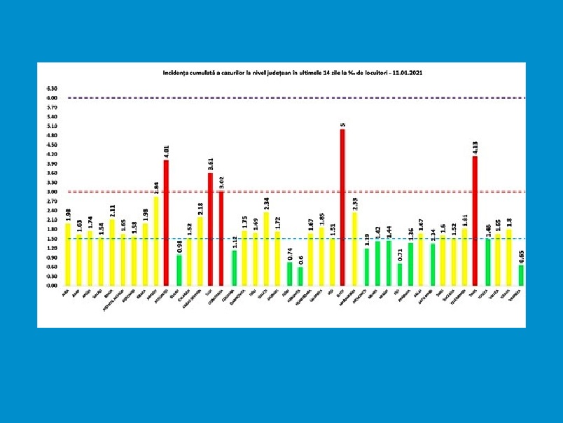 Coeficientul infectărilor cumulate la 14 zile, raportate la 1.000 de locuitori este calculat de către Direcțiile de Sănătate Publică, la nivelul Municipiului București și al județelor. Mai jos aveți graficul realizat în baza raportărilor primite de CNCCI de la Direcțiile de Sănătate Publică: