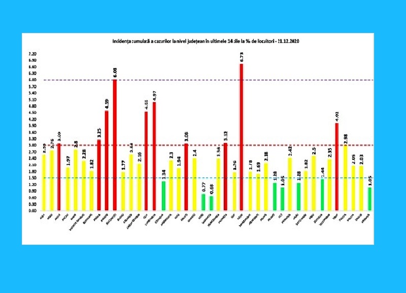 Coeficientul infectărilor cumulate la 14 zile, raportate la 1.000 de locuitori este calculat de către Direcțiile de Sănătate Publică, la nivelul Municipiului București și al județelor. Mai jos aveți graficul realizat în baza raportărilor primite de CNCCI de la Direcțiile de Sănătate Publică: