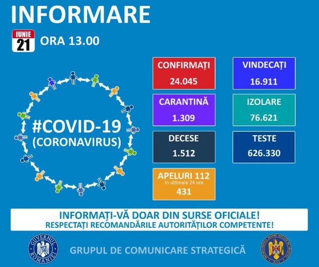 Până astăzi, 21 iunie, pe teritoriul României, au fost confirmate 24.045 de cazuri de persoane infectate cu virusul COVID – 19 (coronavirus). Dintre persoanele confirmate pozitiv, 16.911 au fost declarate vindecate și externate.