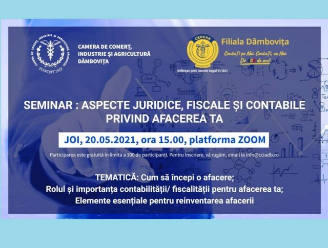 Camera de Comerț, Industrie și Agricultură Dâmbovița, în parteneriat cu Corpul Experților Contabili și Contabililor Autorizați din România (CECCAR), filiala Dâmbovița a organizat ieri, 20 mai 2021, pe platforma Zoom, un seminar gratuit referitor la aspectele juridice, fiscale și contabile privind formele de organizare ale unei afaceri.