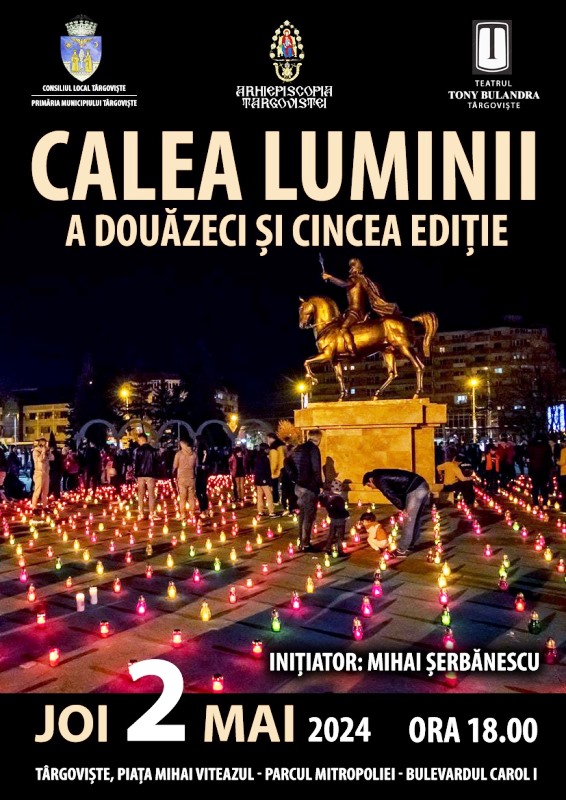 Așa cum v-am anunțat deja aici, „Calea Luminii”, eveniment unic în lume va avea loc și în acest an, la Târgoviște, în Joia Mare sau Joia Patimilor, adică astăzi, 2 mai. „Calea Luminii” este organizată de Primăria și Consiliul Local Municipal Târgoviște, în colaborare cu Arhiepiscopia Târgoviștei și Teatrul „Tony Bulandra” din Târgoviște.