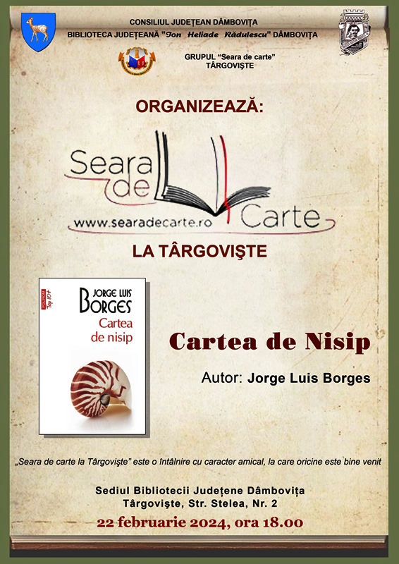 Joi, 22 februarie 2024, ora 18.00, are loc o nouă întâlnire „Seara de carte la Târgovişte”, la sediul Bibliotecii Judeţene „I. H. Rădulescu” Dâmboviţa (Str. Stelea, Nr. 2).