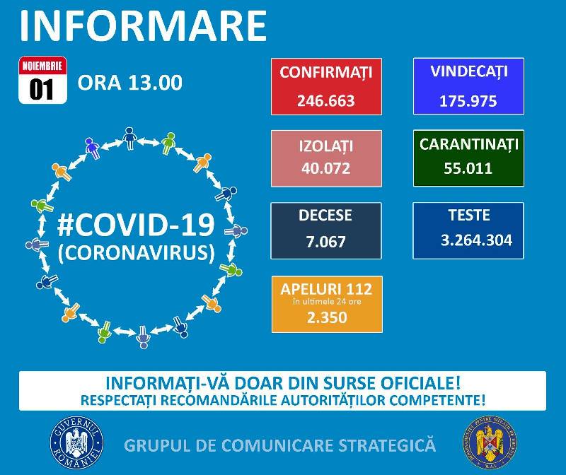 Până astăzi, 1 noiembrie, pe teritoriul României, au fost confirmate 246.663 de cazuri de persoane infectate cu noul coronavirus (COVID – 19).