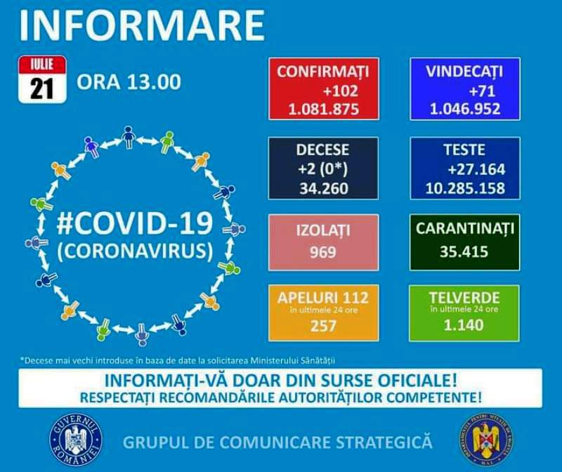 Până astăzi, 21 iulie, pe teritoriul României, au fost confirmate 1.081.875 de cazuri de persoane infectate cu noul coronavirus (COVID – 19).