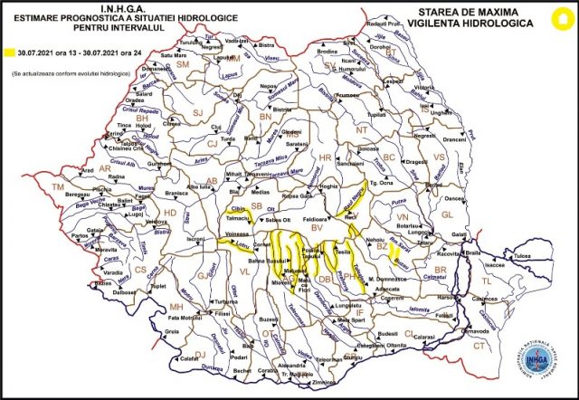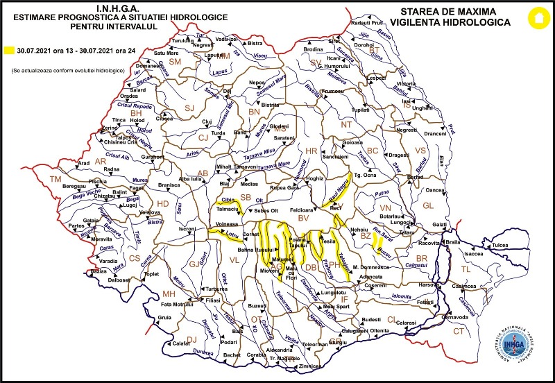 Institutul Național de Hidrologie și Gospodărire a Apelor a emis o avertizare 🟨 COD GALBEN 🟨 valabilă în intervalul 30.07.2021 ora 13:00 – 30.07.2021 ora 24:00, pentru râurile Argeș, Dâmbovița – bazin superior și Ialomița – bazin amonte S.H. Moroeni şi afluenții aferenţi sectorului aval S.H. Moroeni – amonte S.H. Siliştea Snagovului.