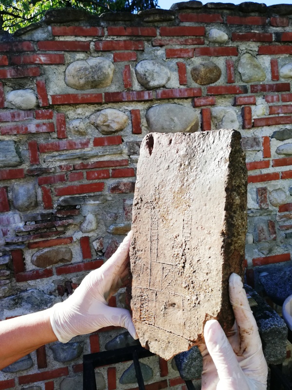 Deosebirea față de o cărămidă obișnuită, găsită deseori într-o săpătură arheologică medievală, constă în prezența pe una din fețe a unor incizii ce indică planul unei clădiri. Funcția religioasă atribuită acestei schițe, dincolo de aspectul insuflat la prima vedere, este susținută și de numeroasele morminte identificate în spațiul cercetat, aproximativ 25 de gropi de înhumație. Prezența planului schițat pe cărămidă îl atribuim unui turn clopotniță, cel mai probabil, ridicat ulterior, ca parte a unui cimitir medieval. Prăbușirea acestuia a fost surprinsă in situ, iar imagini ale acestui dezastru sunt redate în filmul care însoțește cadrul expozițional.