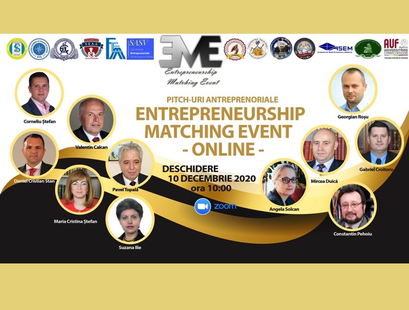 Facultatea de Științe Economice din cadrul Universității „Valahia” din Târgoviște, în parteneriat cu Centrul Studențesc de Antreprenoriat și Gestiunea Afacerilor și Asociația Tinerilor Întreprinzători din Mediul Virtual, organizează, în perioada 10 – 11 decembrie 2020, ediția a VI-a a concursului la nivel studențesc de pitch-uri antreprenoriale ENTREPRENEURSHIP MATCHING EVENT – ONLINE, platforma ZOOM (https://us04web.zoom.us/j/3681814266?pwd=ZGxZNVhMQIpQTmdGaEp3eXAxZk4rdz09) (Meeting ID: 368 181 4266 Passcode: EME2020).