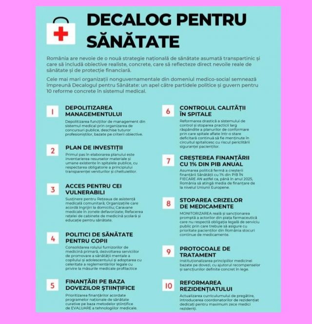 Cele mai importante organizații neguvernamentale care activează de câteva zeci de ani în România în domeniul sănătății Asociația Dăruiește Viață, Asociația Salvați Copiii, HOSPICE Casa Speranței, Fundația Romanian Angel Appeal, Fundația Estuar, World Vision Romania, Asociația Inima Copiilor, Asociația Dăruiește Aripi, Asociația Zi de Bine, Caravana cu Medici și Asociația Națională de Îngrijiri Paliative, propun societății românești adoptarea unui Decalog pentru sănătate, care cuprinde principii și măsuri generale care, dacă vor fi adoptate, vor schimba în bine nu numai sistemul sanitar din țara noastră, ci, mai ales, viața noastră, a tuturor.