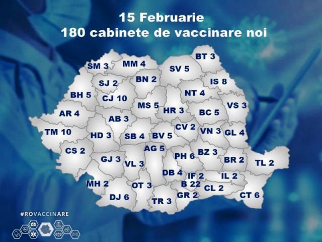 Cele 180 de cabinete destinate vaccinării cu AstraZeneca sunt distribuite după cum urmează: București (22), Alba (3), Arad (4), Argeș (5), Bacău (5), Bihor (5), Bistrița Năsăud (2), Botoșani (3), Brăila (2), Brașov (5), Buzău (3), Călărași (2), Caraș-Severin (2), Cluj (10), Constanța (6), Covasna (2), Dâmbovița (4), Dolj (6), Galați (4), Giurgiu (2), Gorj (3), Harghita (3), Hunedoara (3), Ialomița (2), Iași (8), Ilfov (2), Maramureș (4), Mehedinți (2), Mureș (5), Neamț (4), Olt (3), Prahova (6), Sălaj (2), Satu Mare (3), Sibiu (4), Suceava (5), Teleorman (3), Timiș (10), Tulcea (2), Vâlcea (3), Vaslui (3), Vrancea (3). Acestea vor fi grupate în centrele de vaccinare noi deschise la nivelul fiecărui județ.