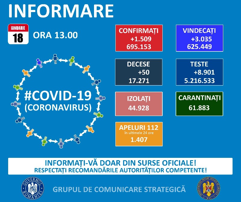 Până astăzi, 18 ianuarie, pe teritoriul României, au fost confirmate 695.153 de cazuri de persoane infectate cu noul coronavirus (COVID – 19).