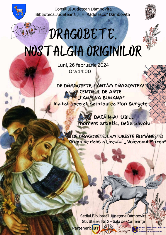 Luni, 26 februarie 2024, orele 14.00, vă invităm la Biblioteca Județeană „I. H. Rădulescu” Dâmbovița să celebrăm iubirea în stilul tradițional românesc, în cadrul programului „Dragobete, nostalgia originilor”.