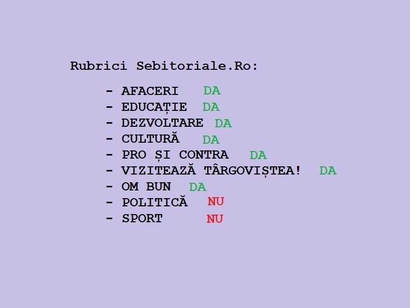 Nu, ziarul nostru nu va avea rubrici speciale dedicate sportului sau politicii. Cititorii noștri cu siguranță că sunt interesați de politică și de sport, unii probabil că le și practică de ceva vreme, cu mai mult sau mai puțin succes. Ziarul nostru, Sebitoriale.Ro, nu va aborda direct aceste frumoase domenii și voi încerca în cele ce urmează să explic această lipsă aparent importantă. (Dacă n-ar fi importantă, de ce vorbim despre ea chiar acum!?)