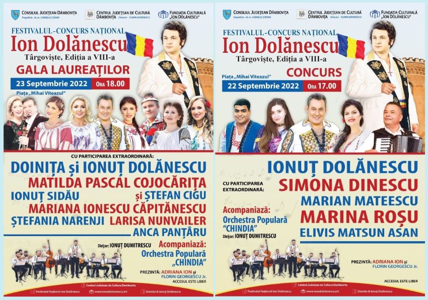 Consiliul Judeţean Dâmboviţa, prin Centrul Judeţean de Cultură Dâmboviţa, alături de Fundaţia Culturală Ion Dolănescu, vă invită în perioada 22-23 septembrie 2022, în Piața Mihai Viteazul din Târgoviște, la un eveniment cultural de marcă, un regal al cântecului popular românesc: Festivalul – Concurs Naţional „Ion Dolănescu”, ediția a VIII-a.