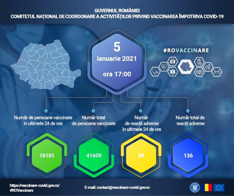 Potrivit datelor puse la dispoziția CNCAV de către Institutul Național de Sănătate Publică, prin aplicația Registrul Electronic Național al Vaccinărilor (RENV), care ține evidența vaccinărilor, situația din ziua de 5 ianuarie a.c., ora 17.00, este următoarea: