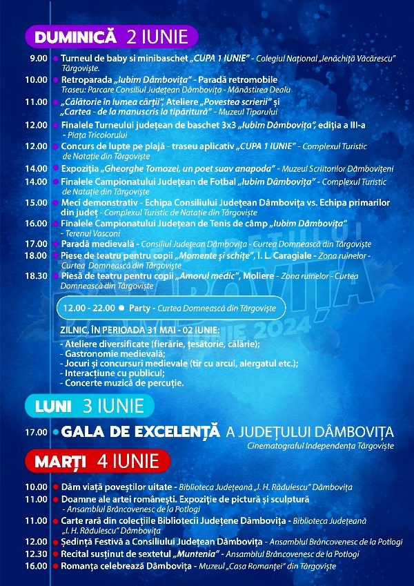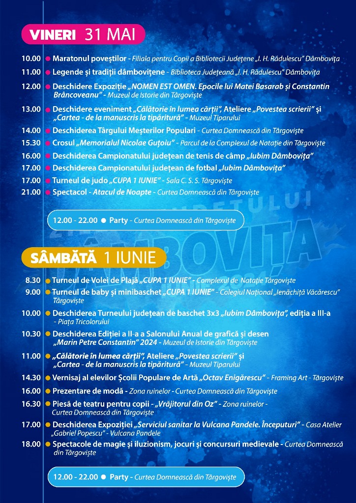 Pentru a stârni curiozitatea celor care vor dori, astfel, să ia parte la această sărbătoare, menționăm că ei vor putea să se afle, la alegere, fie la Târgul Meșterilor Populari, ce va fi deschis la Curtea Domnească din Târgoviște, vineri, 31 mai 2024, ora 14:00, fie la cele 11 expoziții pe teme literare, de istorie și artă, ce vor fi găzduite de Muzeul Tiparului, Muzeul Scriitorilor Dâmbovițeni, Muzeul de Istorie și Biblioteca Județeană I. H. Rădulescu Târgoviște în perioada 31 mai – 4 iunie, fie la diferite întreceri sportive, dintre care amintim: Campionatul județean de tenis de câmp și Campionatul județean de fotbal „Iubim Dâmbovița”, Turneul de judo „Cupa 1 Iunie” și Crosul „Memorialul Nicolae Guțoiu”, toate aceste manifestări sportive urmând să aibă loc pe 31 mai 2024, Turneul județean de baschet 3 x 3 „Iubim Dâmbovița”; Turneul de Volei de Plajă, Turneul de Baby și Minibaschet și Concursul de lupte de plajă – traseu aplicativ „Cupa 1 Iunie”, pe 1 și, respectiv, 2 iunie. Evenimentele sportive se vor desfășura la Târgoviște – la Complexul Turistic de Natație, Sala Clubului Sportiv Școlar, Colegiul Național Ienăchiță Văcărescu și chiar în Piața Tricolorului.