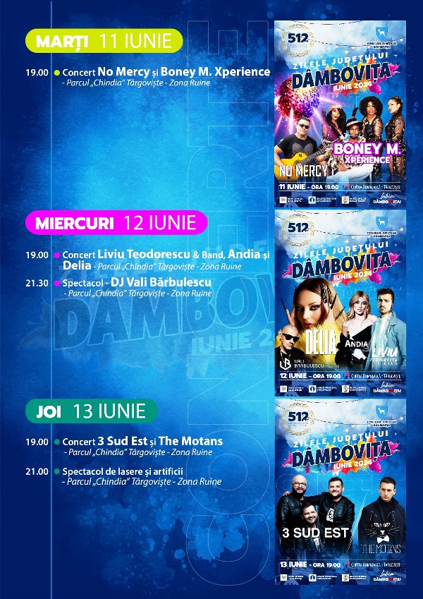Ultimele 3 zile ale ciclului de manifestări aniversare „Zilele Județului Dâmbovița” (11, 12 și 13 iunie) vor transforma zona Ruine din Parcul Chindia Târgoviște într-o uriașă scenă în aer liber, de pe care artiști și formații îndrăgite de publicul român îi vor încânta pe spectatori cu concerte care vor începe, în fiecare seară la ora 19:00: marți, 11 iunie – concertul No Mercy și Boney M. Xperience, miercuri, 12 iunie – concertul Liviu Teodorescu & Band, Andia și Delia și spectacolul DJ Vali Bărbulescu, și joi, 13 iunie – concertul 3 Sud Est și The Motans.
