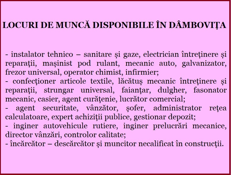 -site: www.anofm.ro – ajofm dambovita – secțiunea persoane fizice/locuri de muncă vacante;
