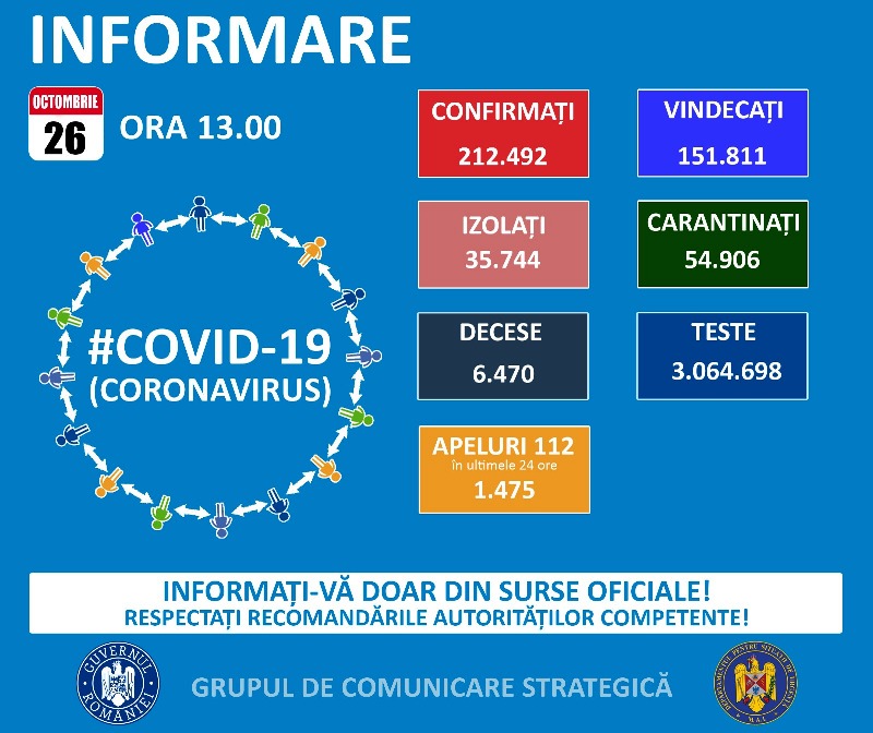 Până astăzi, 26 octombrie, pe teritoriul României, au fost confirmate 212.492 de cazuri de persoane infectate cu noul coronavirus (COVID – 19).