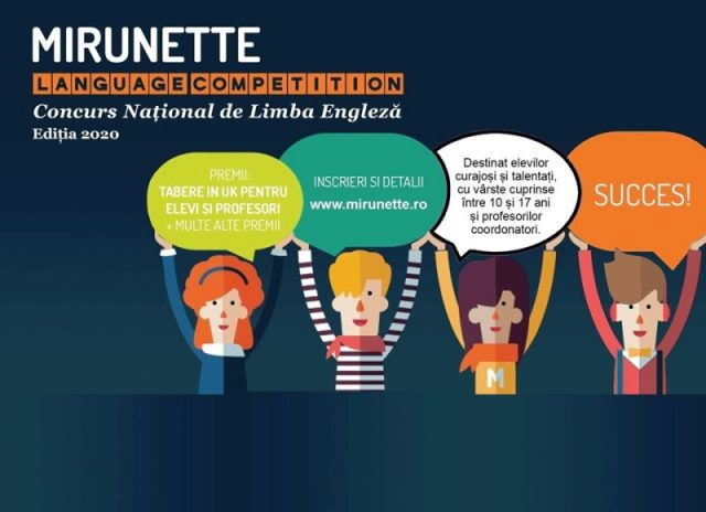 Copilul tău are vârsta de cel puțin 10 ani și cel mult 17 ani și iubește limba engleză, pe care o studiază cu plăcere și interes? Atunci trebuie să afli de oportunitatea de a-și pune la încercare cunoștințele de limba engleză în cadrul concursului Mirunette Language Competition, organizat de Mirunette Education din București. Va avea numai de câștigat, atât prin testarea nivelului la care a ajuns, cât și prin șansa de a câștiga o mulțime de premii constând în gratuitatea Examenului Cambridge de la British Council, cărți interesante de la Editura Humanitas, tratamente dentare de la Dent Estet 4 Teens, bilete gratuite pentru parcuri de distracții, dar și alte premii surpriză care o să-l încânte. Marii câștigători vor primi ca premiu participarea la o tabără internațională ce se va desfășura chiar în Marea Britanie.