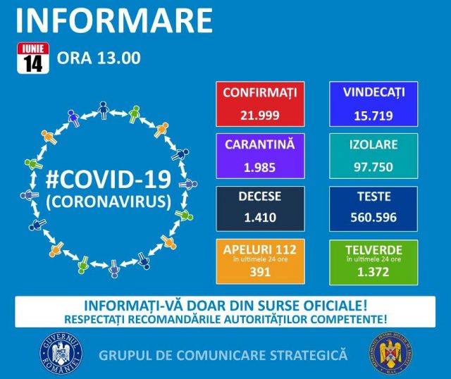 Până astăzi, 14 iunie, pe teritoriul României, au fost confirmate 21.999 de cazuri de persoane infectate cu virusul COVID – 19 (coronavirus). Dintre persoanele confirmate pozitiv, 15.719 au fost declarate vindecate și externate.