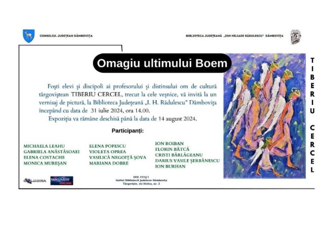 Miercuri, 31 iulie 2024, ora 14.00, foști elevi și discipoli ai profesorului și distinsului om de cultură Tiberiu Cercel, organizează la Biblioteca Județeană ”I. H. Rădulescu” Dâmbovița vernisajul expoziției de pictură „Omagiu ultimului Boem”.