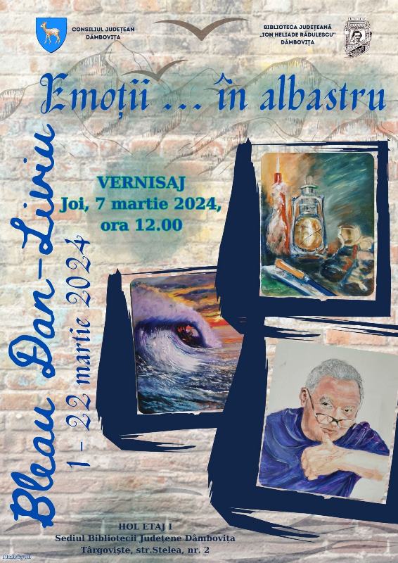 Joi, 7 martie 2024, ora 12.00, Biblioteca Județeană ”I. H. Rădulescu” Dâmbovița organizează vernisajul expoziției de pictură ”Emoții … în albastru”, pictor Dan – Liviu Bleau.