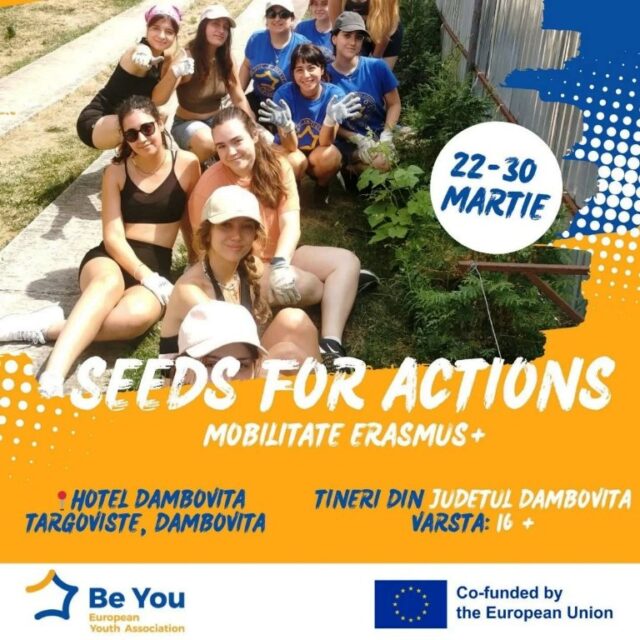 Te invităm la proiectul Erasmus „Seeds for Action” organizat de Asociația Be You în Târgoviște, în perioada 22–30 martie 2026, unde vei crea campanii, reel-uri, videoclipuri și vei lucra cu tineri din Italia, Lituania, Serbia și Bulgaria și pentru un viitor mai sustenabil