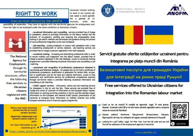ANOFM a elaborat un pliant în limba română, ucraineană și engleză, material ce este postat pe siteul www.anofm.ro și pe rețele de socializare. Pliantul conține și cod QR cu datele de contact ale tuturor agențiilor județene, locale, puncte de lucru, din țară.