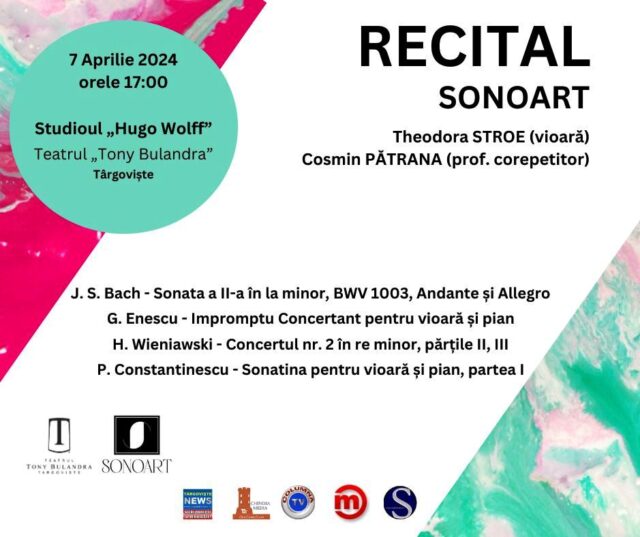 Duminică, 7 aprilie, începând cu ora 17.00, la Teatrul Tony Bulandra din Târgoviște va avea loc un nou concert SONOART. De data aceasta, publicul meloman va putea audia lucrări pentru vioară și pian din creația unor compozitori ca Johann Sebastian Bach, George Enescu, Henryk Wieniawski sau Paul Constantinescu, în interpretarea Theodorei Stroe – vioară și a lui Cosmin Pătrana – pian. Un concert SONOART este mereu un eveniment artistic de excepție, așa că nu ratați întâlnirea cu muzica clasică din acest sfârșit de săptămână, de la Teatrul Tony Bulandra din Târgoviște!